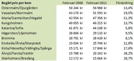 Skärholmen och Bredäng har haft den största prisökningen på bostadsrätter sedan 2008. Utgångspriserna har ökat med 29 procent, men det är fortfarande den stadsdel som har lägst begärda pris med 15 700 kronor per kvadratmeter. Östermalm är den stadsdel med högst utgångspriser med 57 000 kronor per kvadratmeter. Det skiljer därmed 41 300 kronor mellan stadsdelarna med de lägsta och högsta utgångspriserna per kvadratmeter.