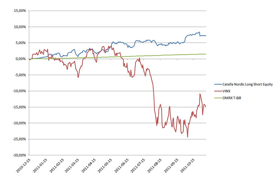 För att vara baserad på en aktiestrategi visar fonden upp en imponerande Sharpekvot på 1,45. Catella Nordic Long/Short Equity har sin legala hemvist i en UCITS III-struktur i Luxemburg och har cirka 200 miljoner kronor under förvaltning.