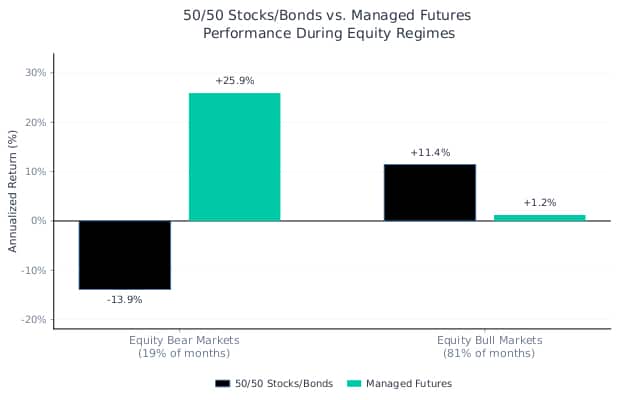 Source: Bloomberg. 50/50 Stocks/Bonds is a monthly rebalanced blend of the S&P 500 Index (“SPX”) and Bloomberg US Aggregate Bond Index (“LBUSTRUU”). Managed Futures is the Société Générale Trend Index (“NEIXCTAT”). All portfolios are rebalanced monthly. You cannot invest in an index. Returns are gross of all fees. Returns are gross of taxes. Returns assume the reinvestment of all distributions. Past performance is not indicative of future results. Equity Bear Markets defined as the four largest drawdown periods of U.S. Stocks since index joint inception. Equity Bull Markets defined as the periods from 12/31/1999 through 12/31/2025 not specified in the Bear Market periods. Period is 12/31/1999 to 12/31/2025.