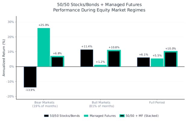 Source: Bloomberg. 50/50 Stocks/Bonds is a monthly rebalanced blend of the S&P 500 Index (“SPX”) and Bloomberg US Aggregate Bond Index (“LBUSTRUU”). Managed Futures is the Société Générale Trend Index (“NEIXCTAT”). 50/50 + MF (Stacked) adds the monthly excess return of the SG Trend Index over T-bills to the monthly rebalanced 50/50 blend. All portfolios are rebalanced monthly. You cannot invest in an index. Returns are gross of all fees. Returns are gross of taxes. Returns assume the reinvestment of all distributions. Past performance is not indicative of future results. Equity Bear and Bull Market definitions consistent with Exhibit 2. Period is 12/31/1999 to 12/31/2025.