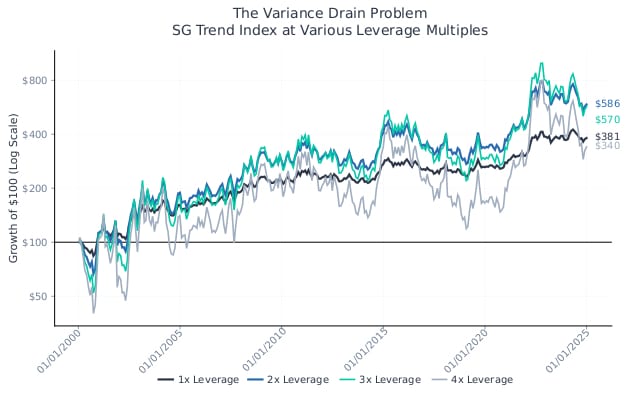 This approach introduces two underappreciated problems. First, higher leverage accentuates variance drain: the mathematical drag on compounded returns that increases with the square of volatility. At moderate levels, the additional exposure still improves outcomes. At 1x, the SG Trend Index delivered roughly $3.81 of cumulative growth per dollar invested since 2000; at 2x, this rose to $5.86. But at 3x, returns improved to only $5.70, and at 4x, they actually declined to $3.40, underperforming the unleveraged index (Exhibit 4). The mathematics are manageable in a portfolio context, where the higher-volatility fund is sized to a target notional contribution and rebalanced frequently. The problem is product salability: when the line item underperforms its own unleveraged benchmark, the conversation shifts from portfolio construction to manager due diligence, and the allocation becomes difficult to sustain.