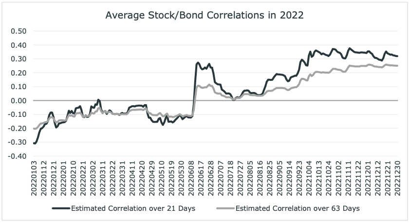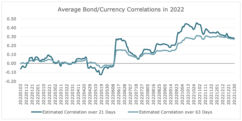 In addition to performance, there were a few other interesting quantitative themes to note in 2022. In a year with both stocks and bonds down, correlation sure didn’t help either. Stock/bond correlation began the year negative and moved to relatively positive for most the second half of the year. Figure 2 plots the correlation between stocks and bonds in 2022. Although this relationship is one that is widely followed by investors, there is another interesting quantitative theme that was quite pronounced: the correlation between fixed income and currencies, which came in markedly positive this year. Figure 3 plots the correlation between foreign currencies (short the U.S. dollar) and fixed income in 2022. (In simple terms, the U.S. dollar was positively correlated with interest rates.)