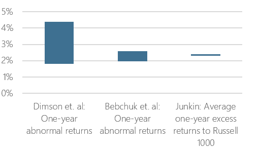 Elroy Dimson from Cambridge looked at how ESG engagement by active investors can drive superior returns. These engagements often have a broader motivation than traditional activism, as they seek among others the company to focus on its “triple bottom line,” corporate governance, and other matters. While this approach might be deemed “soft” by selected investors, it does potentially provide robust companies with sustainable growth patterns. In the study by Dimson et al., successful active engagement on ESG delivers strong results of 1.8-4.4% one-year abnormal returns.