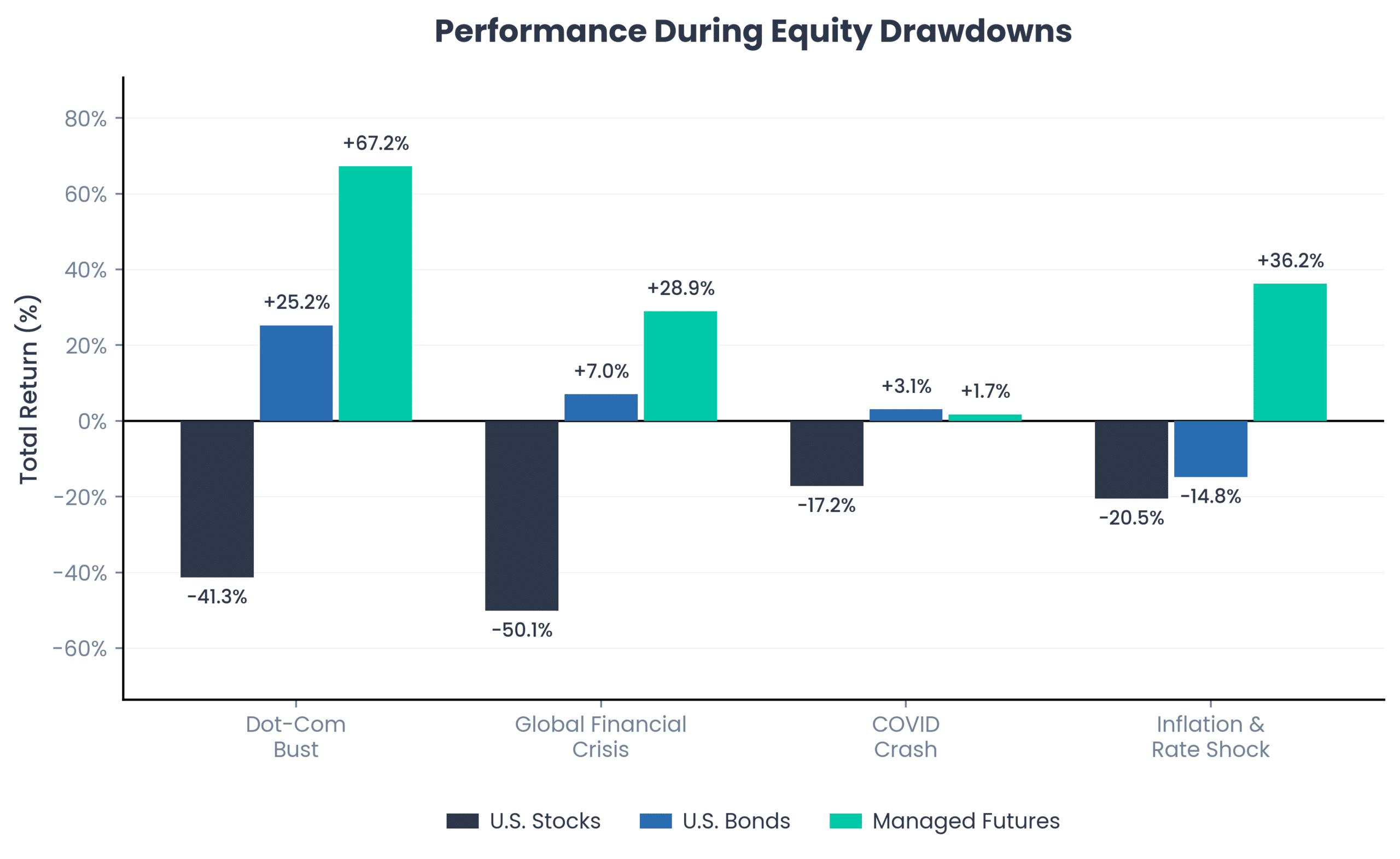 Source: Bloomberg. U.S. Stocks is the S&P 500 Index (“SPX”). U.S. Bonds is the Bloomberg US Aggregate Bond Index (“LBUSTRUU”). Managed Futures is the Société Générale Trend Index (“NEIXCTAT”), which is net of management fees, performance fees, and transaction costs. Returns for both U.S. Stocks and U.S. Bonds are gross of all fees. Returns are gross of taxes. Returns assume the reinvestment of all distributions. Past performance is not indicative of future results. Periods shown: Dot-Com Bust (August 2000 – September 2002), Global Financial Crisis (October 2007 – February 2009), COVID Crash (December 2019 – March 2020), Inflation & Rate Shock (December 2021 – September 2022). Periods selected reflect the largest drawdown periods of U.S. Stocks since index joint inception. You cannot invest in an index. Period is 12/31/1999 through 12/31/2025.