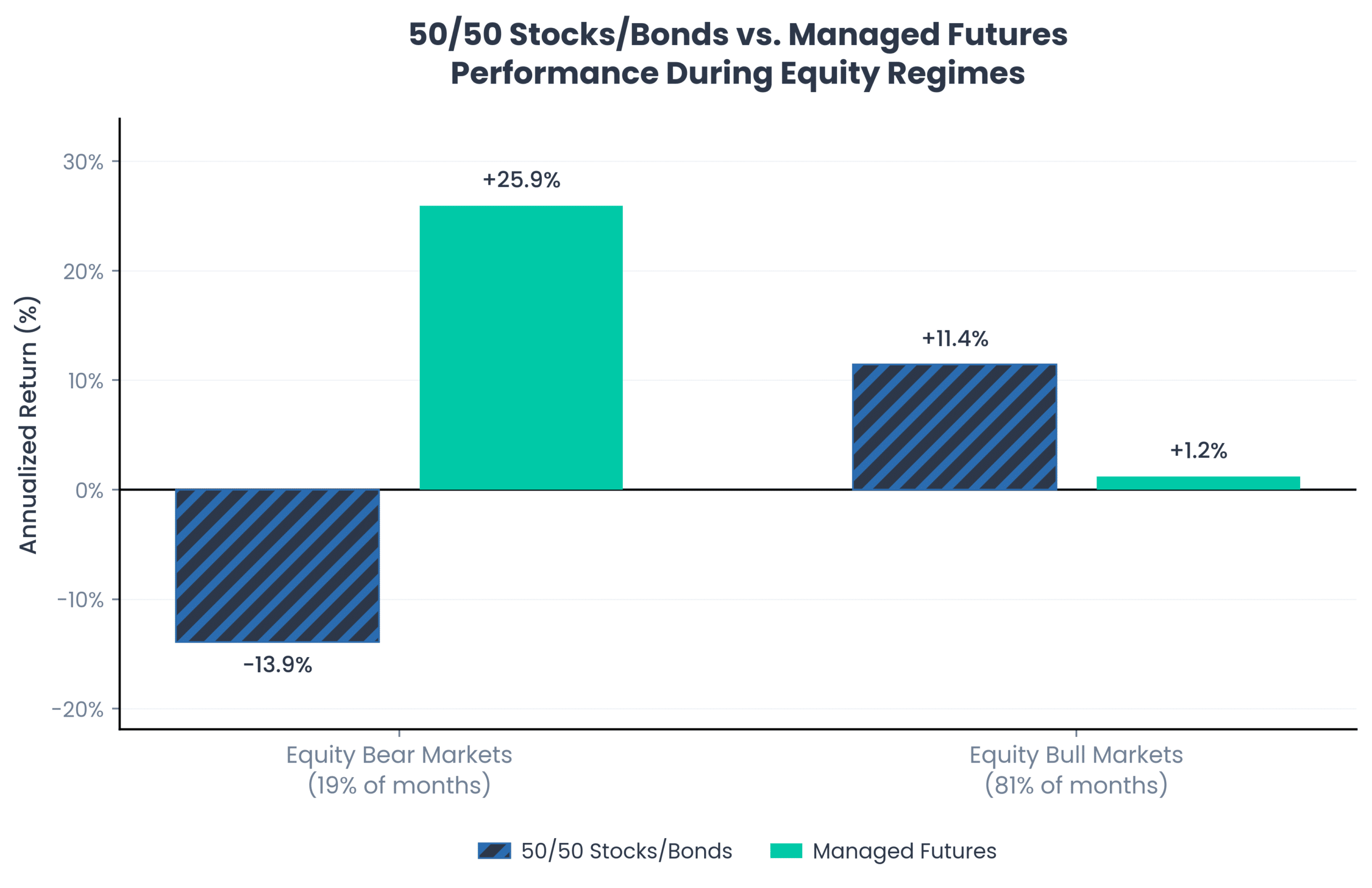Source: Bloomberg. 50/50 Stocks/Bonds is a monthly rebalanced blend of the S&P 500 Index (“SPX”) and Bloomberg US Aggregate Bond Index (“LBUSTRUU”). Managed Futures is the Société Générale Trend Index (“NEIXCTAT”). All portfolios are rebalanced monthly. You cannot invest in an index. Returns are gross of all fees. Returns are gross of taxes. Returns assume the reinvestment of all distributions. Past performance is not indicative of future results. Equity Bear Markets defined as the four largest drawdown periods of U.S. Stocks since index joint inception. Equity Bull Markets defined as the periods from 12/31/1999 through 12/31/2025 not specified in the Bear Market periods. Period is 12/31/1999 to 12/31/2025.