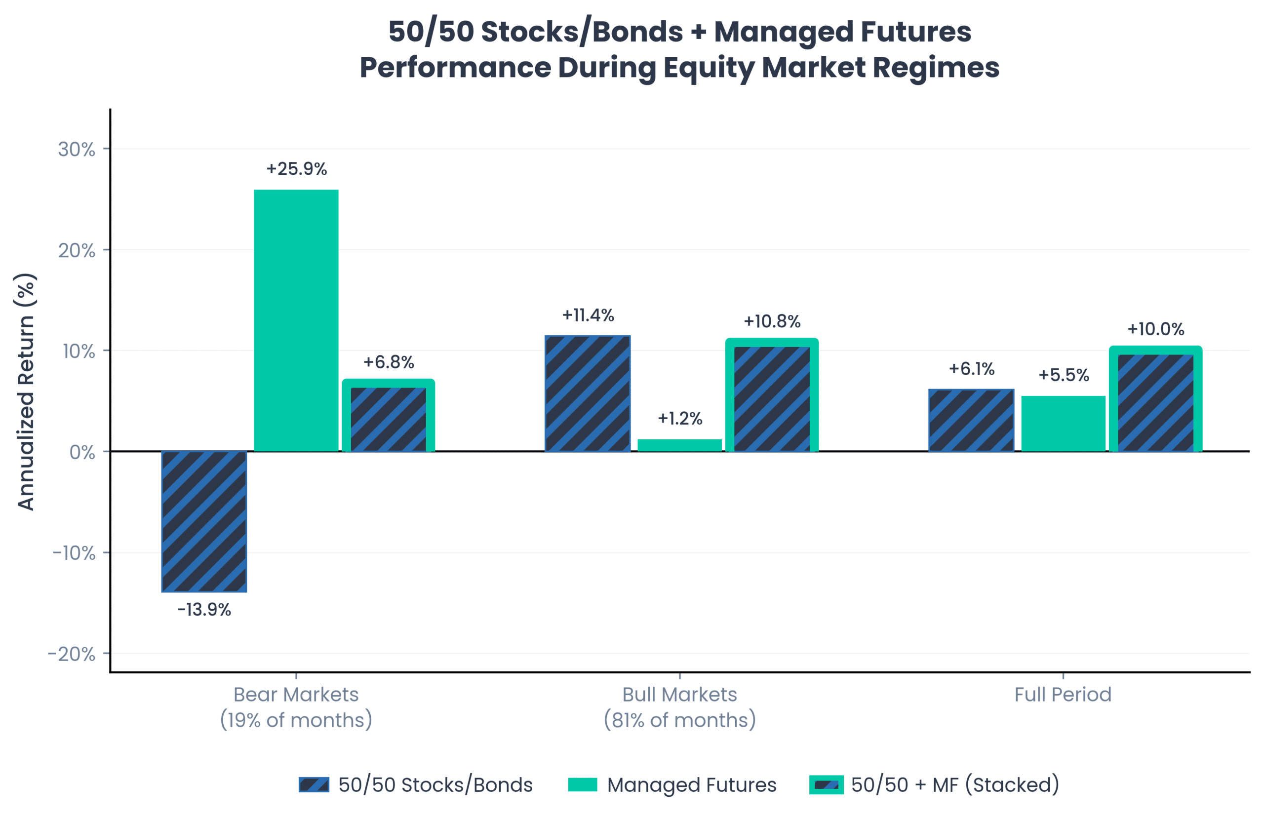 At its fullest historical expression, stacking 100% managed futures excess returns on top of the 50/50 blend would have returned +10.8% annualized during bull markets, nearly matching the 50/50’s +11.4%. During bear markets, it would have returned +6.8% versus –13.9% for the 50/50 alone (Exhibit 3). Over the full period, stacking delivered 10.0% annualized returns compared to 6.1% for the 50/50 and 5.5% for managed futures individually.