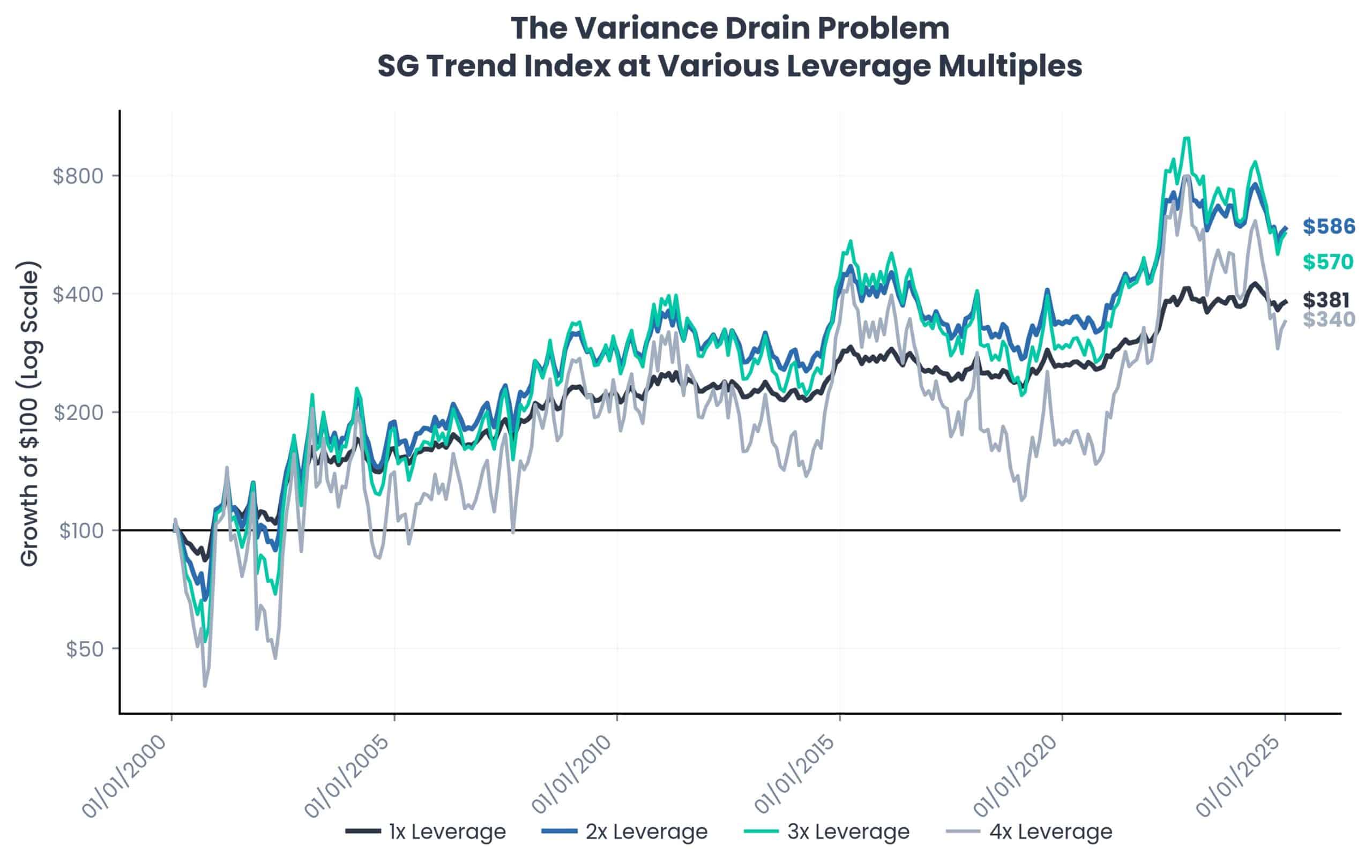 Source: Bloomberg, Société Générale. Hypothetical growth of $100 invested in the SG Trend Index (“NEIXCTAT”) at various leverage multiples. Leveraged returns are calculated by scaling monthly excess returns (over T-bills) by the stated multiple and adding back the monthly T-bill return. Leverage is rebalanced monthly (i.e. the leverage multiple is maintained at the stated level each month). You cannot invest in an index. Returns are gross of all fees. Returns are gross of taxes. Returns assume the reinvestment of all distributions. Past performance is not indicative of future results. Period is 12/31/1999 through 12/31/2025.
